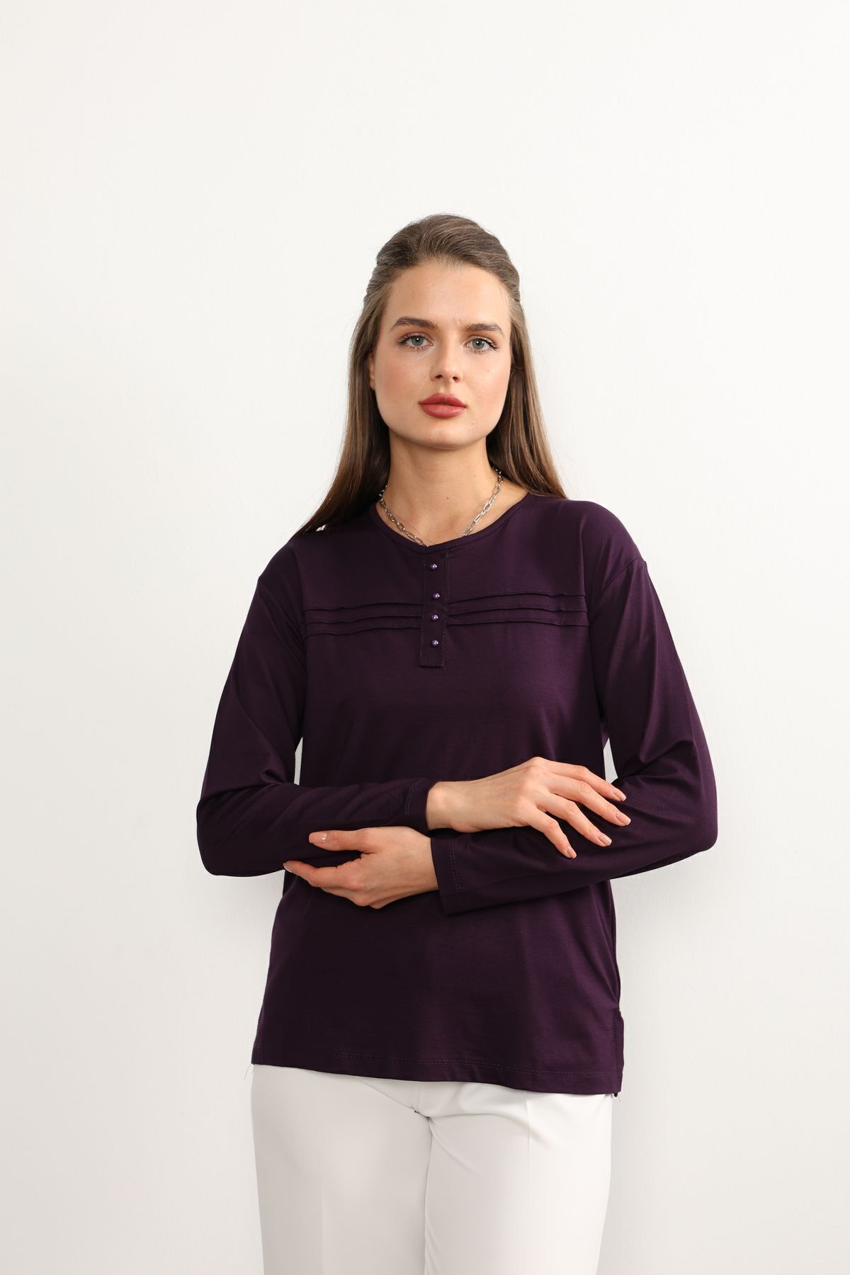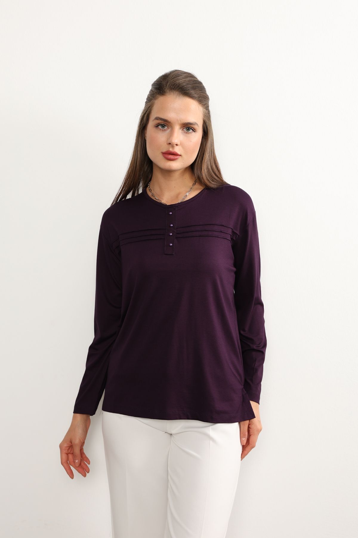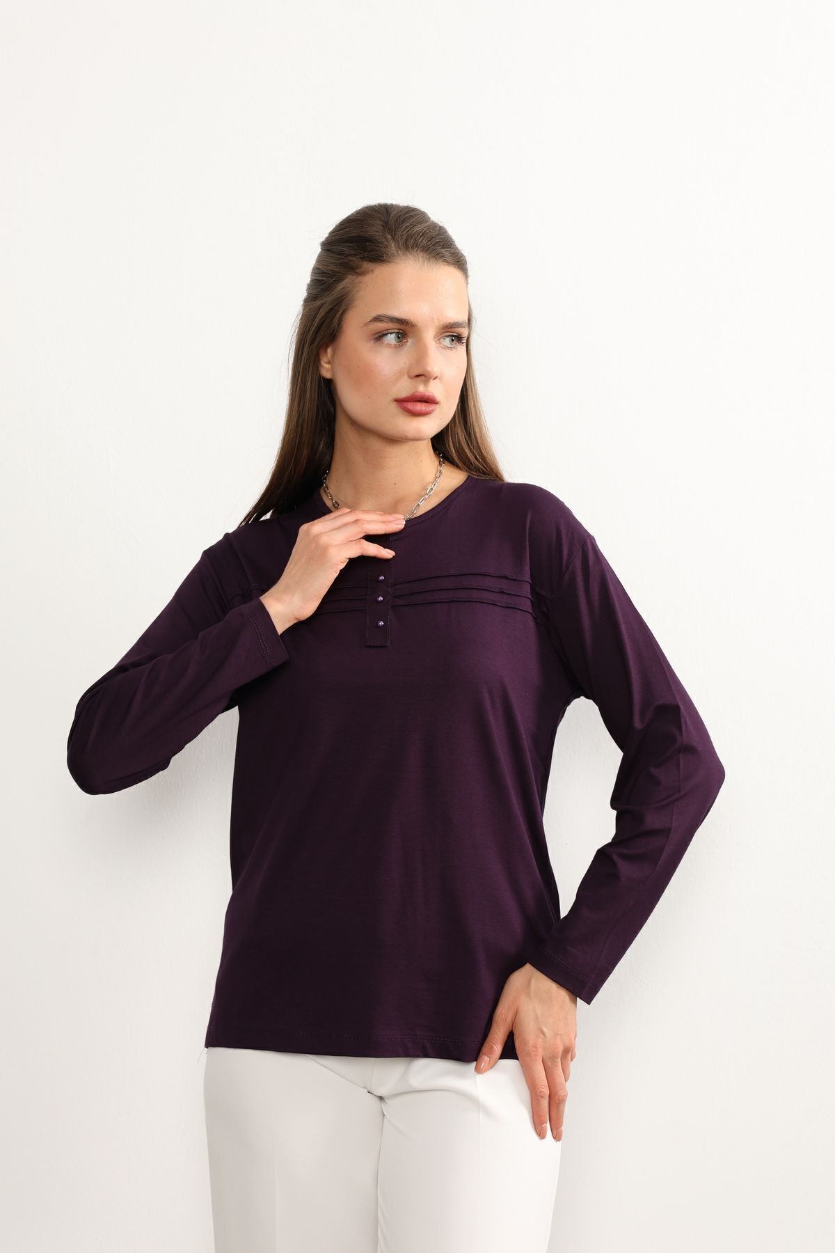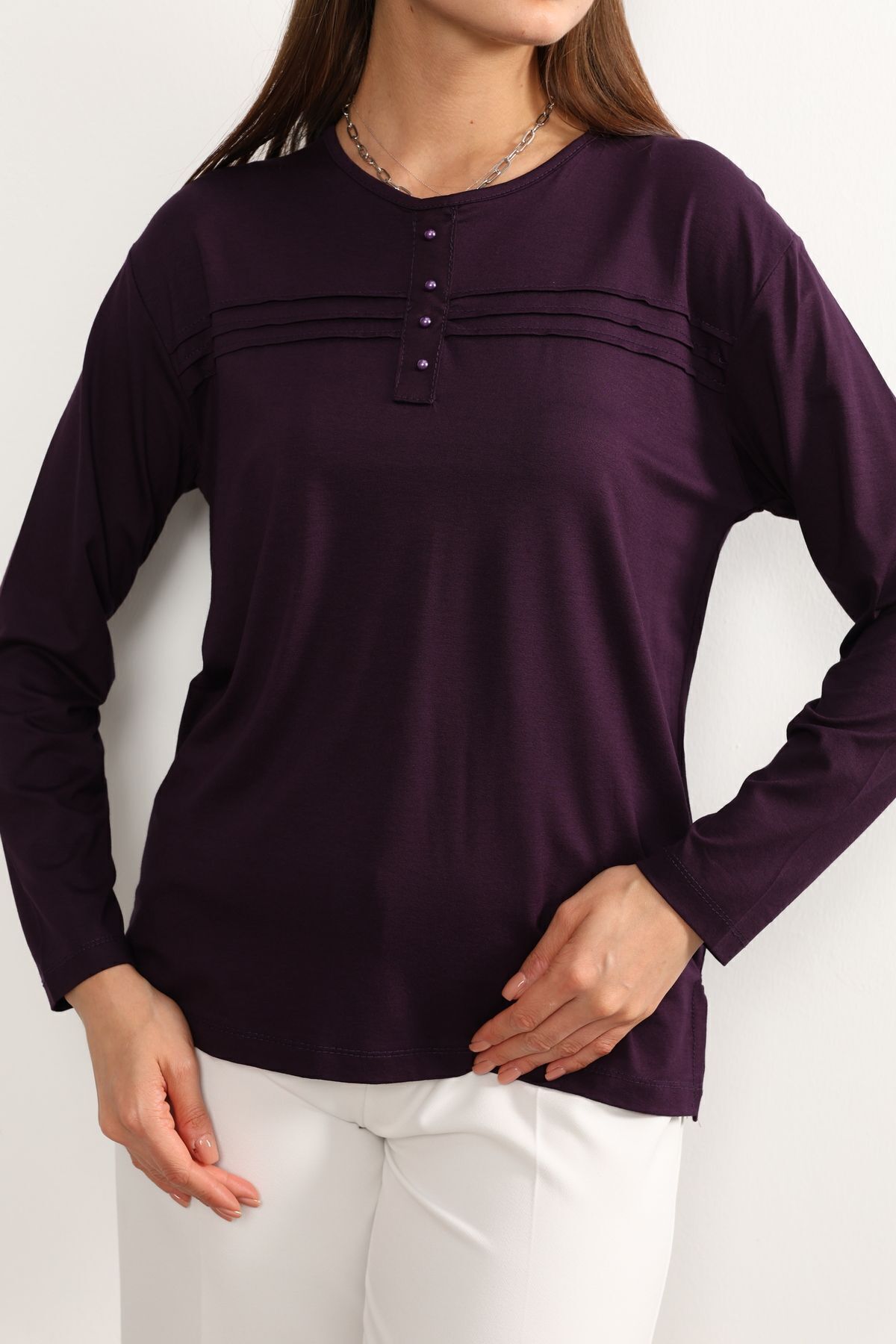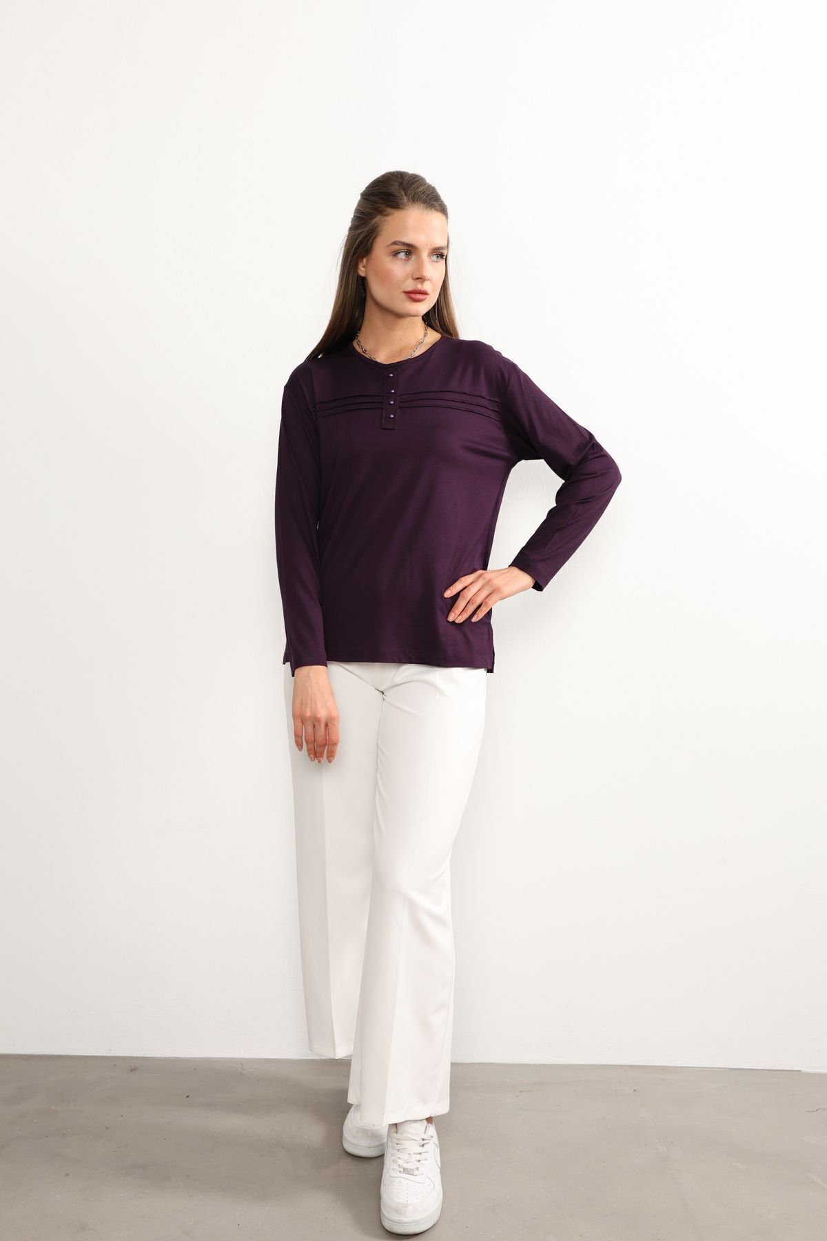 - Rahat kesimi ile günlük kullanım için ideal olan bu lacivert anne penye bluz, şıklığı konforla buluşturuyor.; - Regular kalıp sayesinde her vücut tipine uyum sağlayarak rahat bir oturuş sunar.; - 30 derecede yıkama imkanı ile kolay bakım avantajı sağlar; böylece zamandan tasarruf edilirken cildinize zarar gelmez.; - Orta kalınlıkta kumaşı mevsim geçişlerinde ideal sıcaklıkta tutar ve mevsim normallerine uyum sağlar.; - İç göstermeyen yapısıyla rahatlıkla tercih edilebilir; günlük aktivitelerinizde kendinizi güvende hissedersiniz.; - Kemersiz tasarımı sayesinde pratik kullanım sunarken, şerit detaylarıyla modern bir görünüm kazandırır.; - Organik materyaliyle sürdürülebilir moda anlayışına katkıda bulunurken aynı zamanda cildinizle dosttur.; - Uzun kollu yapısı ile mevsim koşullarına uygun koruma sağlar; serin havalarda bile sıcak tutar.; - Basic silueti sayesinde farklı aksesuarlarla kolayca kombinlenebilir; gardrobunuzdaki çok yönlü parçalar arasına girer.; - Bisiklet yaka detayı ile sade ama şık bir görünüm sunarken likralı dokusu esnekliği arttırarak gün boyu rahat hareket etmenizi sağlar.; - Kapamasız tasarımıyla basit kullanım imkanı tanırken, süprem dokuma tipi dayanıklılığı arttırır.; - Cepsiz yapısıyla minimalist tarzınıza uyum sağlarken şerit detaylarıyla dikkat çekici bir stil oluşturur.; - Tesettür giyim koleksiyonuna ait bu bluz, tesettürlü kadınların da tercihi olacak şekilde tasarlanmıştır.; - Süprem dokuma tipinin sunduğu yumuşaklıkla teninizde nazikçe hissedilirken likra materyali esnekliği arttırarak gün boyu konforlu bir deneyim yaşatır.; - Tüm sezonlarda rahatlıkla tercih edebileceğiniz bu lacivert anne penye bluzu, gardrobunuza renk katmak için idealdir.; - Astarsız oluşuyla hafiflik kazandırırken kapamasız yapısıyla pratik kullanım sunar; böylece her anınıza eşlik eder.; - Kapsız tasarımı sayesinde rahatlıkla giyilip çıkartılabilir; zamandan tasarruf etmenizi sağlar.; - Düz deseniyle sadelikten yana olanların beğenisini kazanırken şerit detaylarıyla modern çizgilere sahip olmanızı sağlar.; - Tesettür giyim koleksiyonuna ait olmasıyla hem şıklığı hem de tesettür prensiplerine uygunluğu ön plana çıkartır.; - Likralı materyali esneklik kazandırarak vücut hatlarınıza mükemmel uyum sağlar; hareket özgürlüğünüzü kısıtlamaz.; - Gündüzden geceye her ortama uyum sağlayan bu lacivert anne penye bluz, her anınıza eşlik ederken stil sahibi görünmenizi sağlar.; - XL bedeniyle geniş beden skalasına hitap ederek herkes için erişilebilirlik sunar; geniş beden seçenekleri sayesinde rahatlıkla tercih edebilirsiniz.; - Astarsız oluşuyla minimalist yaklaşımı benimseyenlerin beğenisini kazanırken şerit detaylarıyla göz alıcı bir dokunuş ekler.; - Kapamasız yapısıyla pratik kullanım imkanı tanırken süprem dokuma tipinin sunduğu yumuşaklıkla teninizde nazikçe hissedilir; likra materyali esnekliği arttırarak gün boyu konforlu bir deneyim yaşatır.Tesettür giyim koleksiyonuna özel tasarlanmış, rahat kesimiyle her vücut tipine uyum sağlayan kadın likralı anne penye bluz.; Gündüzden geceye her ortama uygun, şık ve pratik tasarımıyla dikkat çeken düz kesimli bluz.; Uzun kollu yapısı ile mevsim geçişlerinde ideal sıcaklık sağlayan, aynı zamanda zarif bir görünüm sunan bluz.; Regular kalıp sayesinde gün boyu konforlu bir kullanım imkanı veren kadın bluzu.; Sade ve düz mor rengiyle kolayca kombinleyebileceğiniz, her ortamda fark yaratan zarif şerit detaylı bluz.; İç göstermeyen özelliği sayesinde gönül rahatlığıyla hareket özgürlüğünüzü artırırken şıklığınızdan ödün vermezsiniz.; Orta kalınlığındaki kumaşı ile mevsim koşullarına göre ideal sıcaklıkta tutar.; Ekstra kalın askısı sayesinde omuzlarınızda ağırlık yapmadan konforlu bir kullanım sağlar.; Tüm yaş gruplarına hitap eden geniş beden skalasıyla herkesin gardrobunda yerini alacak olan bu bluz, günlük stilinizi tamamlamanız için idealdir.; Likra içeriği sayesinde esneklik kazanan bu bluz, vücut hatlarınıza mükemmel uyum sağlayarak hareket özgürlüğünüzü arttırır.; Bisiklet yakası ile sade ama şık bir duruş sergileyerek her tür kombininize kolayca adapte olur.; Uzun kollarının yanında viskon süprem dokuma tipi kullanarak hem kaliteli hem de dayanıklı bir yapı sunar.;