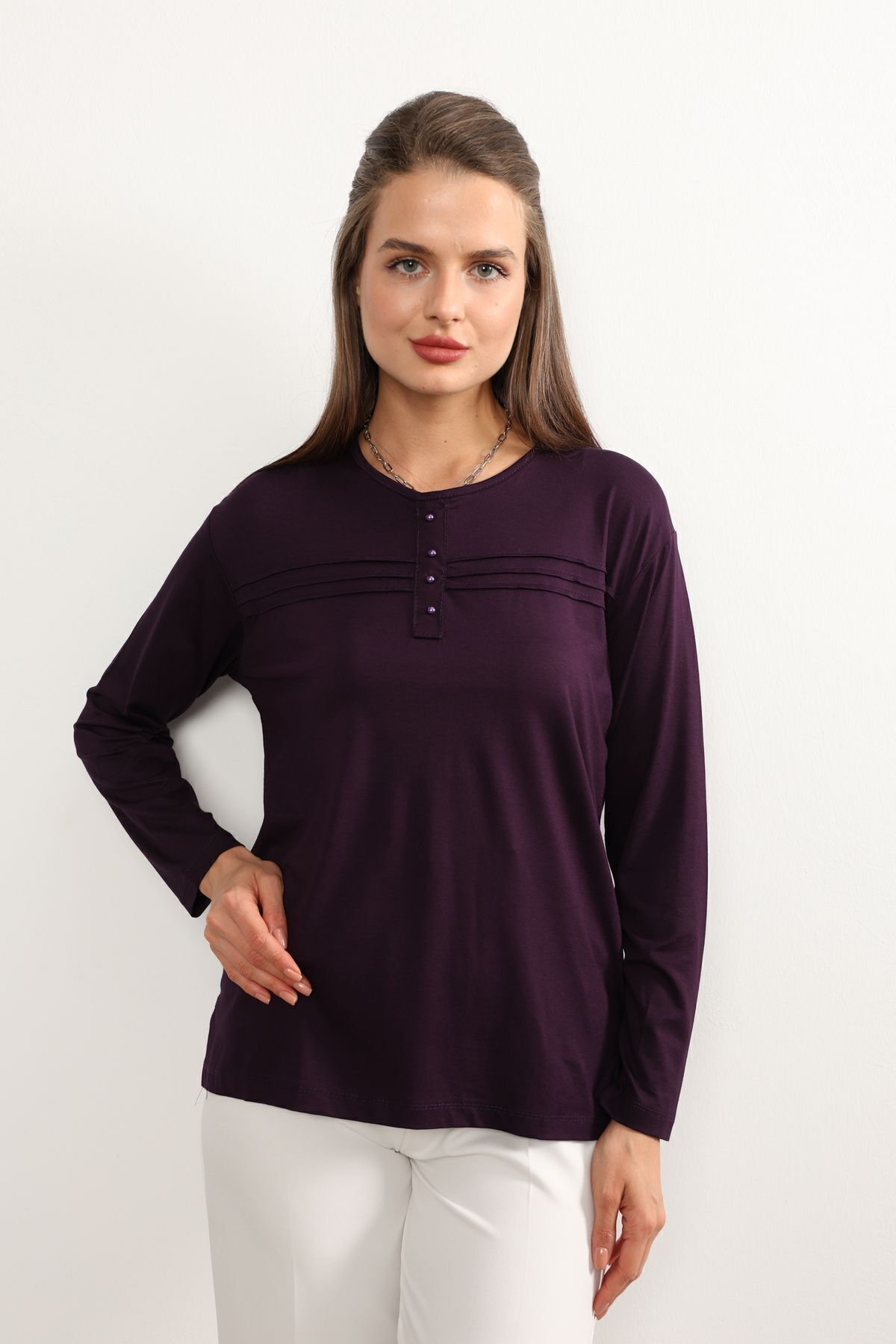 Kadın Likralı Büyük Beden Yeşil Anne Penye Bluz Yeni Sezon Çizgili Şeritli Mor - 5XL