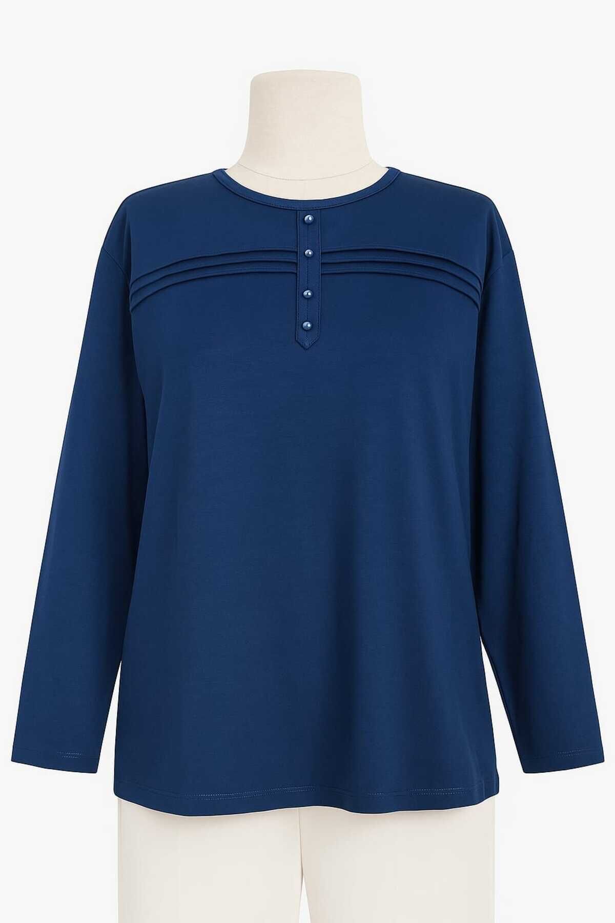 - Rahat kesimi ile günlük kullanım için ideal olan bu lacivert anne penye bluz, şıklığı konforla buluşturuyor.; - Regular kalıp sayesinde her vücut tipine uyum sağlayarak rahat bir oturuş sunar.; - 30 derecede yıkama imkanı ile kolay bakım avantajı sağlar; böylece zamandan tasarruf edilirken cildinize zarar gelmez.; - Orta kalınlıkta kumaşı mevsim geçişlerinde ideal sıcaklıkta tutar ve mevsim normallerine uyum sağlar.; - İç göstermeyen yapısıyla rahatlıkla tercih edilebilir; günlük aktivitelerinizde kendinizi güvende hissedersiniz.; - Kemersiz tasarımı sayesinde pratik kullanım sunarken, şerit detaylarıyla modern bir görünüm kazandırır.; - Organik materyaliyle sürdürülebilir moda anlayışına katkıda bulunurken aynı zamanda cildinizle dosttur.; - Uzun kollu yapısı ile mevsim koşullarına uygun koruma sağlar; serin havalarda bile sıcak tutar.; - Basic silueti sayesinde farklı aksesuarlarla kolayca kombinlenebilir; gardrobunuzdaki çok yönlü parçalar arasına girer.; - Bisiklet yaka detayı ile sade ama şık bir görünüm sunarken likralı dokusu esnekliği arttırarak gün boyu rahat hareket etmenizi sağlar.; - Kapamasız tasarımıyla basit kullanım imkanı tanırken, süprem dokuma tipi dayanıklılığı arttırır.; - Cepsiz yapısıyla minimalist tarzınıza uyum sağlarken şerit detaylarıyla dikkat çekici bir stil oluşturur.; - Tesettür giyim koleksiyonuna ait bu bluz, tesettürlü kadınların da tercihi olacak şekilde tasarlanmıştır.; - Süprem dokuma tipinin sunduğu yumuşaklıkla teninizde nazikçe hissedilirken likra materyali esnekliği arttırarak gün boyu konforlu bir deneyim yaşatır.; - Tüm sezonlarda rahatlıkla tercih edebileceğiniz bu lacivert anne penye bluzu, gardrobunuza renk katmak için idealdir.; - Astarsız oluşuyla hafiflik kazandırırken kapamasız yapısıyla pratik kullanım sunar; böylece her anınıza eşlik eder.; - Kapsız tasarımı sayesinde rahatlıkla giyilip çıkartılabilir; zamandan tasarruf etmenizi sağlar.; - Düz deseniyle sadelikten yana olanların beğenisini kazanırken şerit detaylarıyla modern çizgilere sahip olmanızı sağlar.; - Tesettür giyim koleksiyonuna ait olmasıyla hem şıklığı hem de tesettür prensiplerine uygunluğu ön plana çıkartır.; - Likralı materyali esneklik kazandırarak vücut hatlarınıza mükemmel uyum sağlar; hareket özgürlüğünüzü kısıtlamaz.; - Gündüzden geceye her ortama uyum sağlayan bu lacivert anne penye bluz, her anınıza eşlik ederken stil sahibi görünmenizi sağlar.; - XL bedeniyle geniş beden skalasına hitap ederek herkes için erişilebilirlik sunar; geniş beden seçenekleri sayesinde rahatlıkla tercih edebilirsiniz.; - Astarsız oluşuyla minimalist yaklaşımı benimseyenlerin beğenisini kazanırken şerit detaylarıyla göz alıcı bir dokunuş ekler.; - Kapamasız yapısıyla pratik kullanım imkanı tanırken süprem dokuma tipinin sunduğu yumuşaklıkla teninizde nazikçe hissedilir; likra materyali esnekliği arttırarak gün boyu konforlu bir deneyim yaşatır.- Likralı kumaş yapısı sayesinde esneklik ve konfor sunar, hareket özgürlüğünüzü kısıtlamaz.; - Orta yaş ve üzeri kadınlar için ideal, dört mevsim rahatlıkla tercih edilebilecek bir tasarıma sahiptir.; - Yeni sezon çizgili şeritli deseniyle modern ve şık bir görünüm kazandırır.; - Prl.; mavisi renk seçeneğiyle günlük kullanım için idealdir; hem evde hem dışarıda rahatlıkla giyilebilir.; - Kol tipi ve yaka tipi gibi detaylar belirtilmemiş olsa da, genel olarak rahat ve kullanışlı bir yapıya sahiptir.; - Ürün kutu durumu, kalınlık, baskı/nakış tekniği gibi detaylar hakkında bilgi verilmemiştir.; - Cep, astar durumu, kemer/kuşak durumu, kapama şekli, kap gibi özellikler hakkında net bilgi bulunmamaktadır.; - Yıkama talimatları ve sürdürülebilirlik detayları gibi konularda açıklama yapılmamıştır.; - Paket içeriği ve menşei bilgileri de belirtilmemiştir.; - Koleksiyon, siluet, kap boyu gibi detaylar hakkında bilgi verilmemiştir.; -
