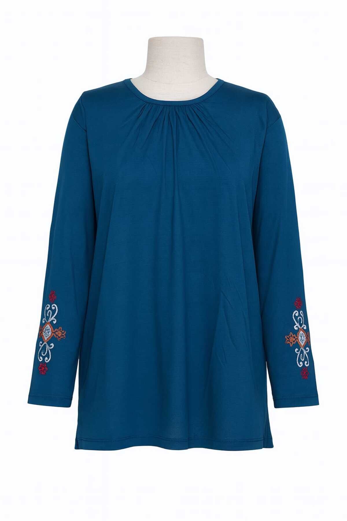 Kadın Likralı Orta Yaş Ve Üzeri Dört Mevsim Füme Anne Penye Bluz Yeni Sezon Kolu İşlemeli Açık Mavi - L