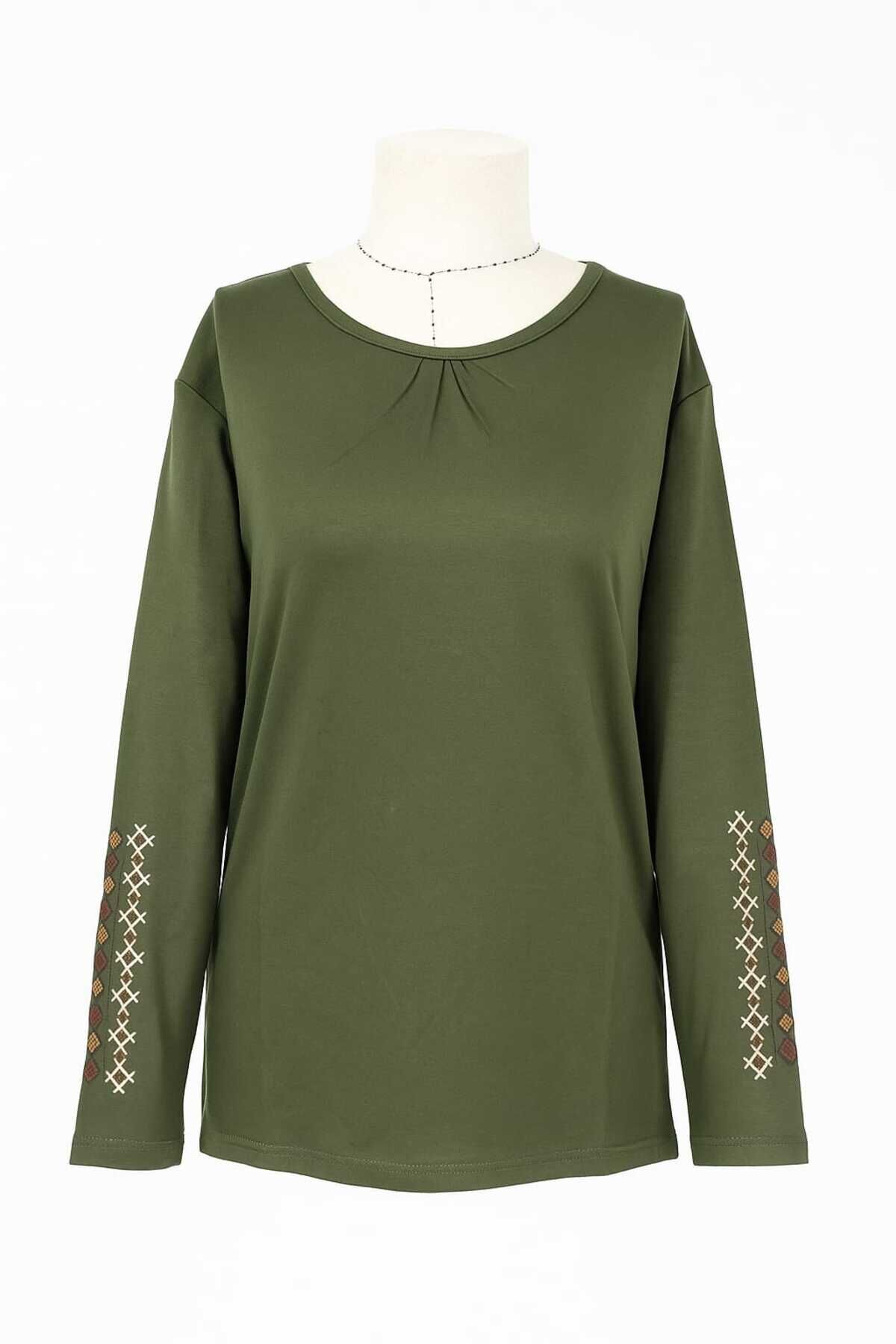 Kadın Likralı Orta Yaş Ve Üzeri Dört Mevsim Füme Anne Penye Bluz Yeni Sezon Kolu İşlemeli Haki - XL