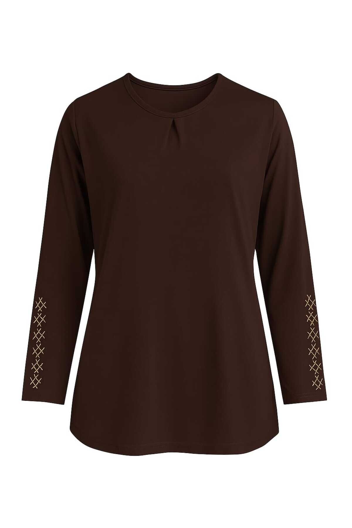Kadın Likralı Orta Yaş Ve Üzeri Dört Mevsim Füme Anne Penye Bluz Yeni Sezon Kolu İşlemeli Kahverengi - 2XL