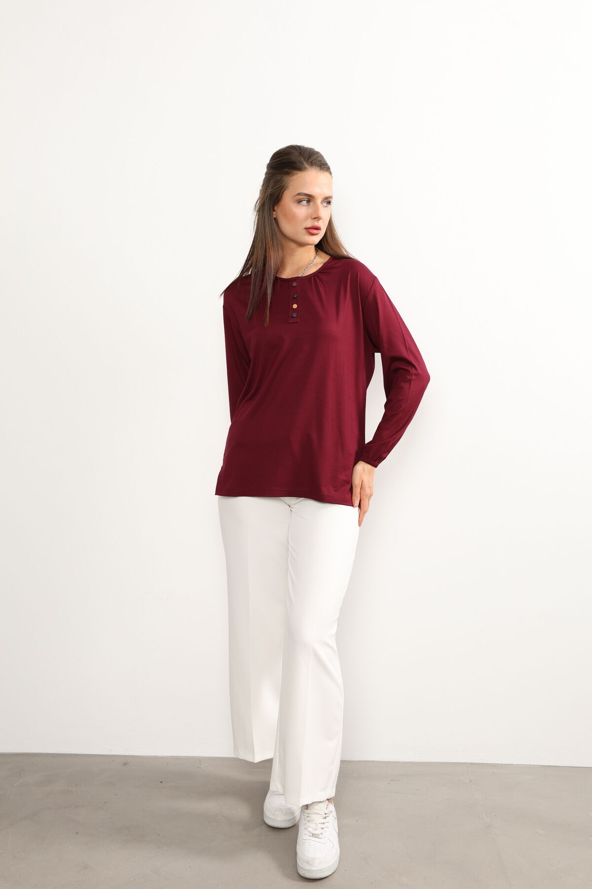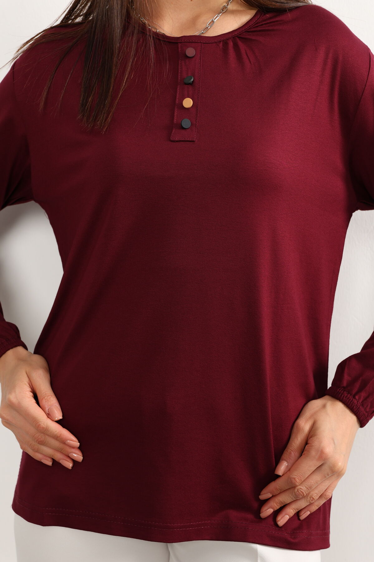 Kadın Likralı Orta Yaş Ve Üzeri Dört Mevsim Yeşil Anne Penye Bluz Düğme Desenli Lastikli Kol Bordo - 3XL