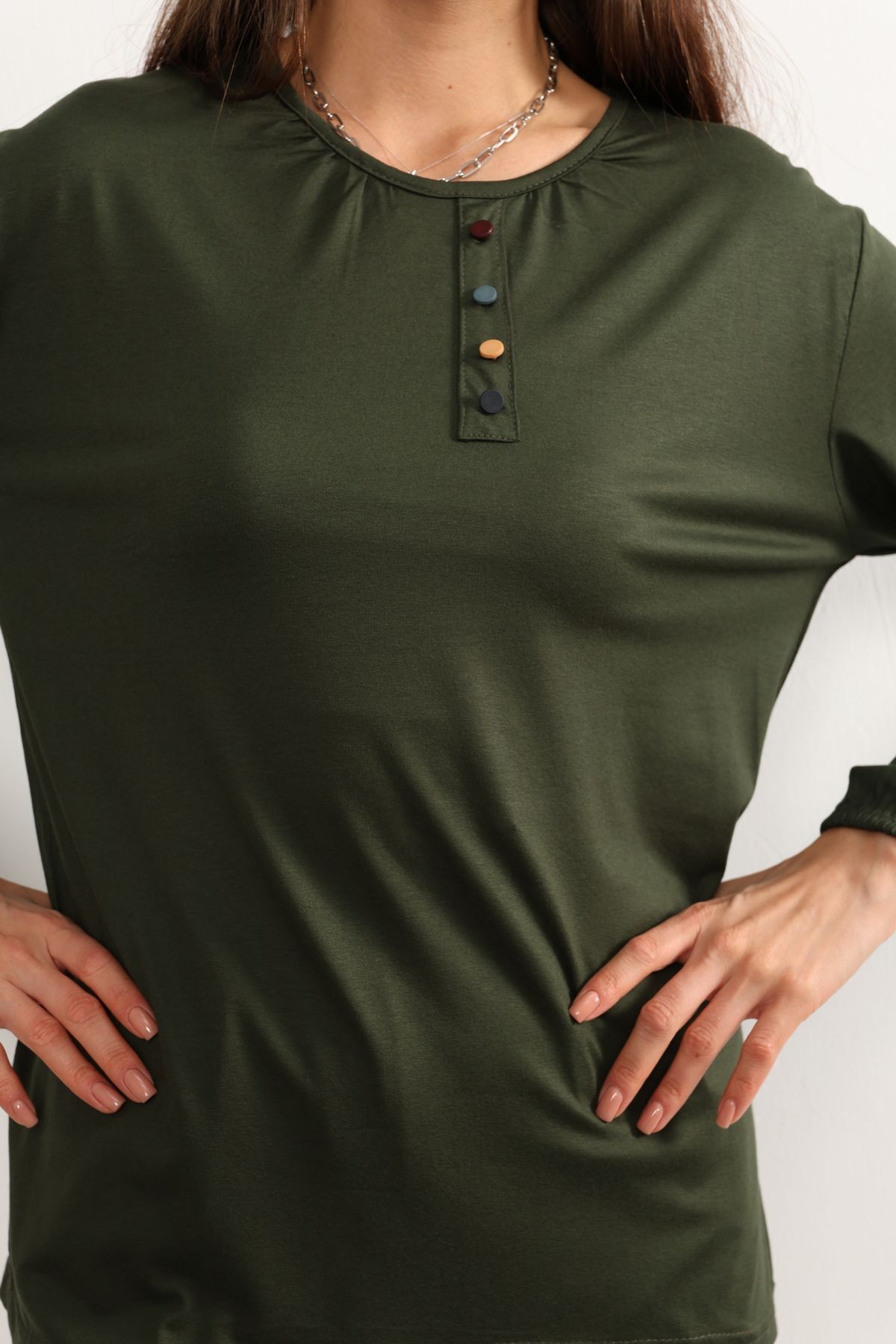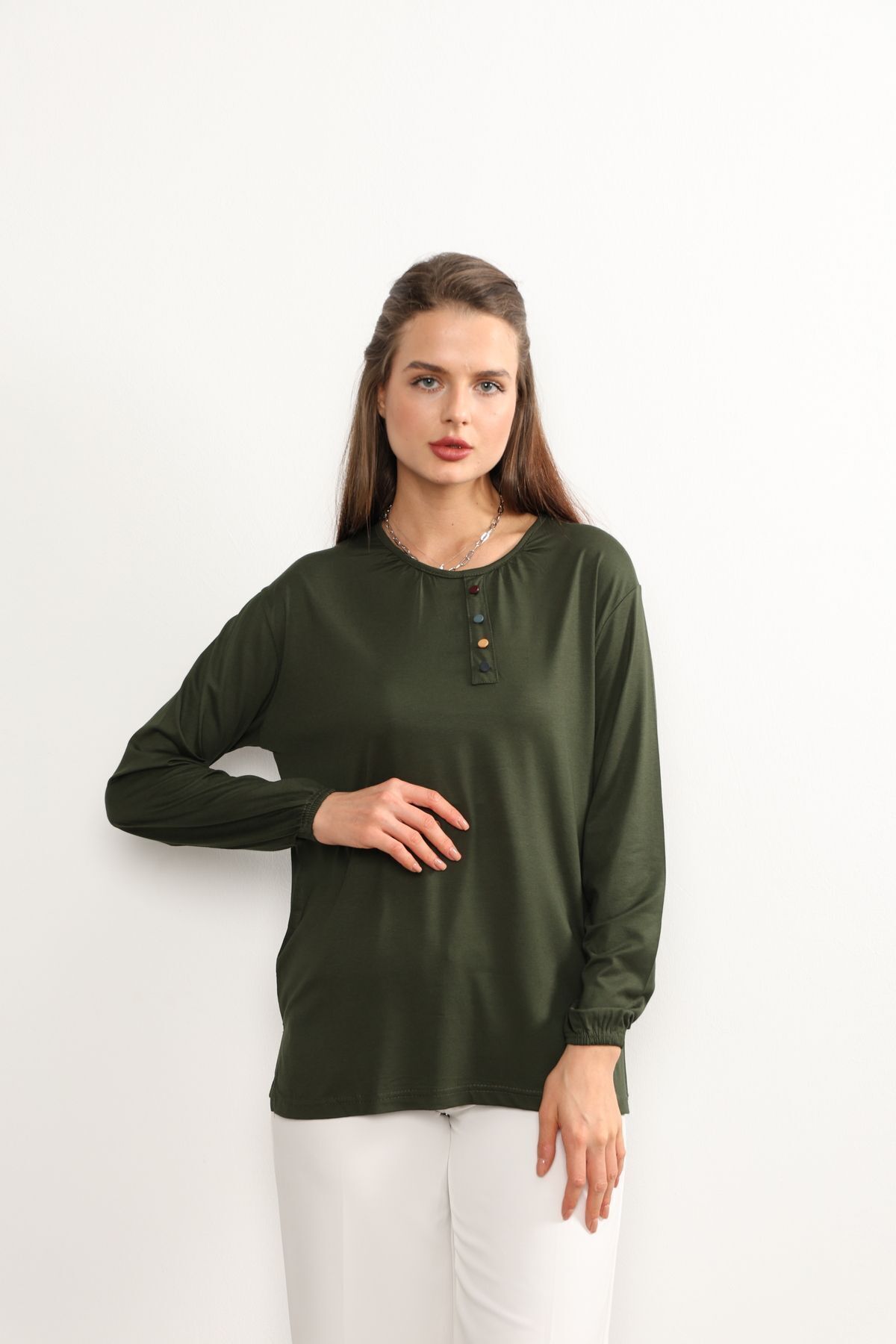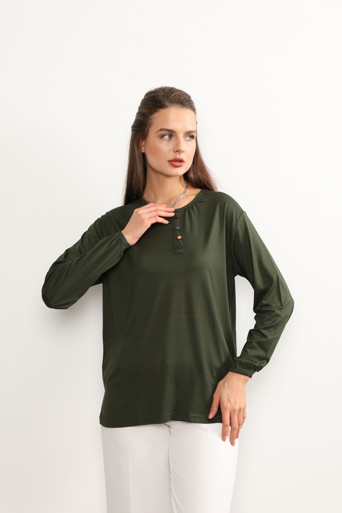 Kadın Likralı Orta Yaş Ve Üzeri Dört Mevsim Yeşil Anne Penye Bluz Düğme Desenli Lastikli Kol Haki - M