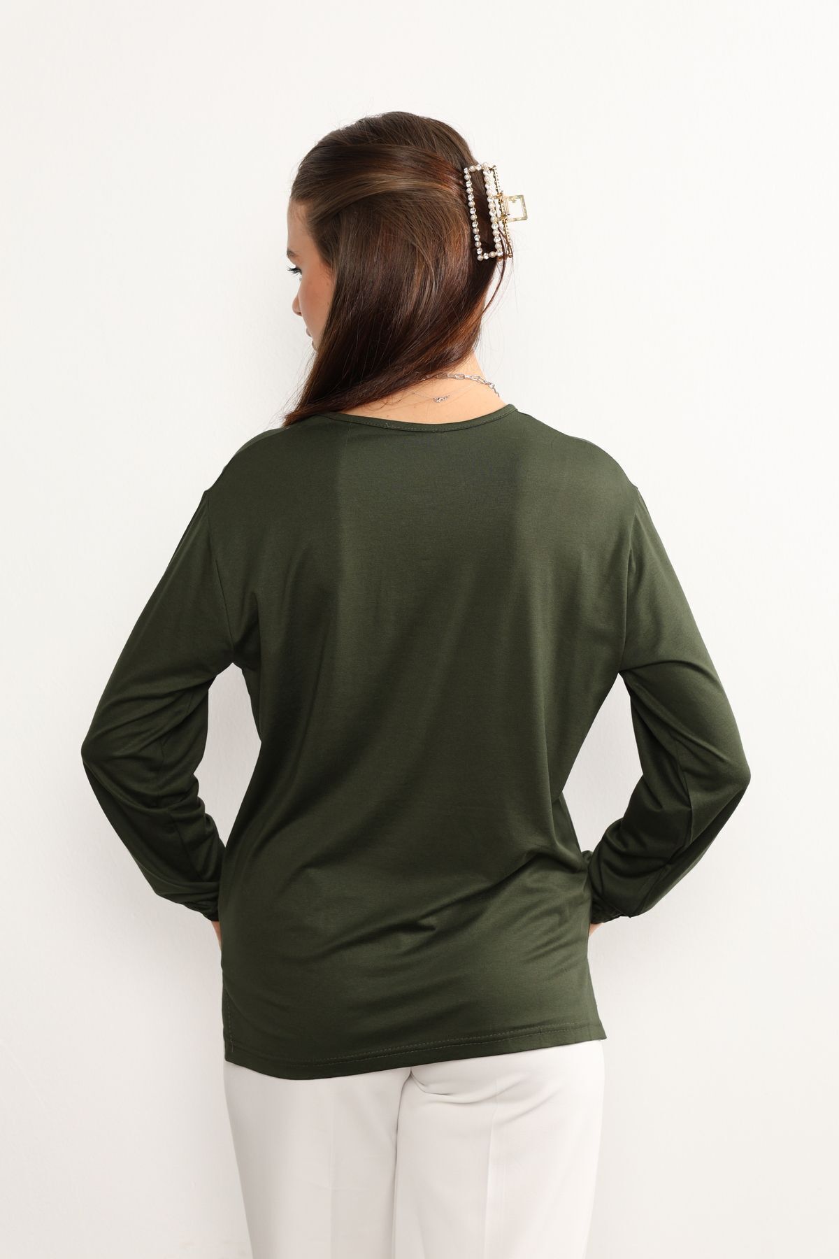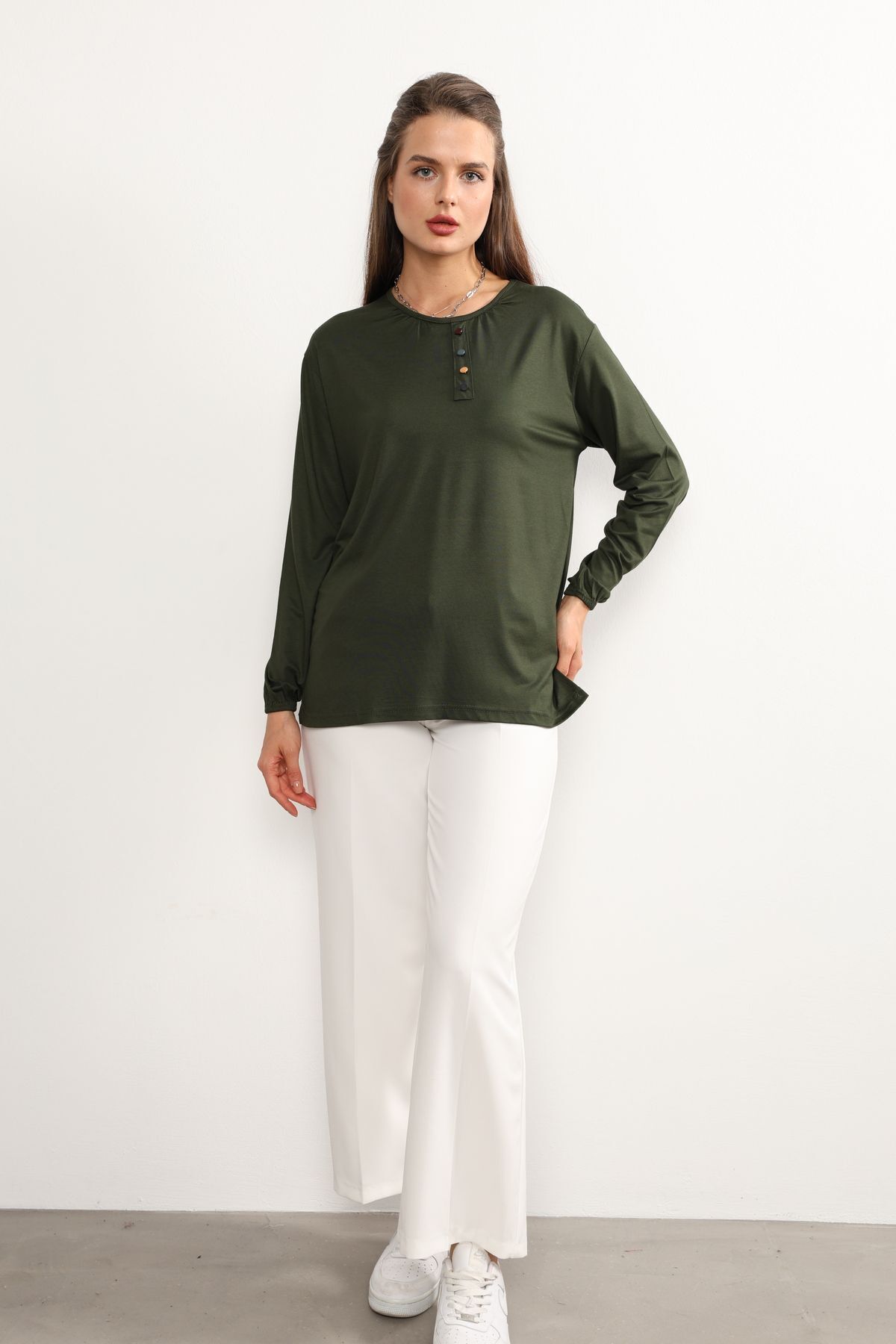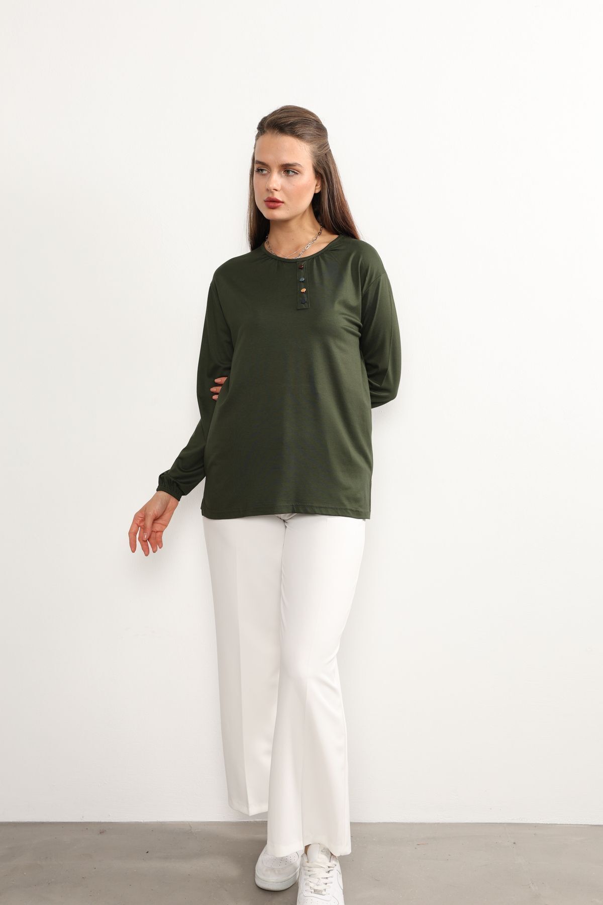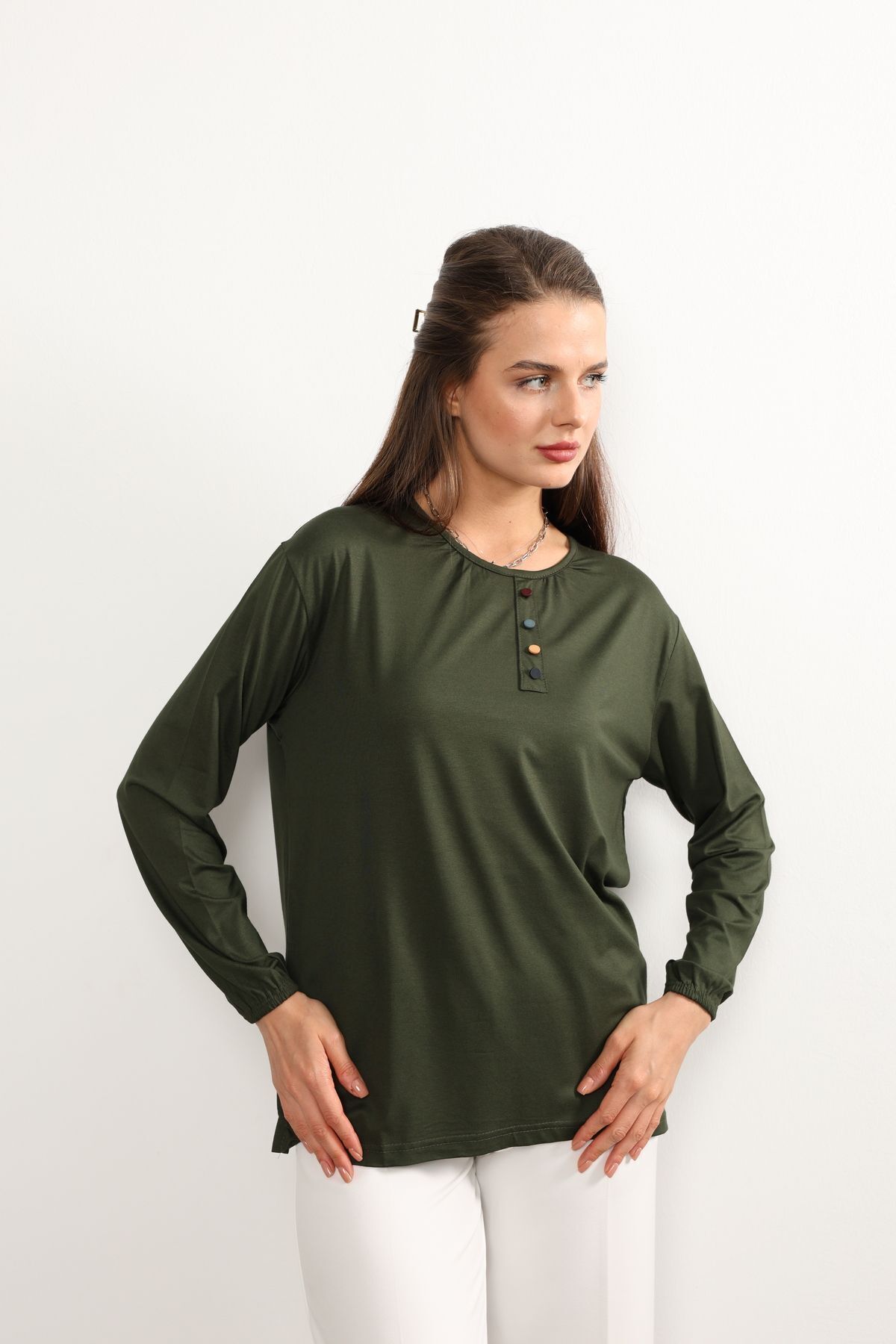 Kadın Likralı Orta Yaş Ve Üzeri Dört Mevsim Yeşil Anne Penye Bluz Düğme Desenli Lastikli Kol Haki - M