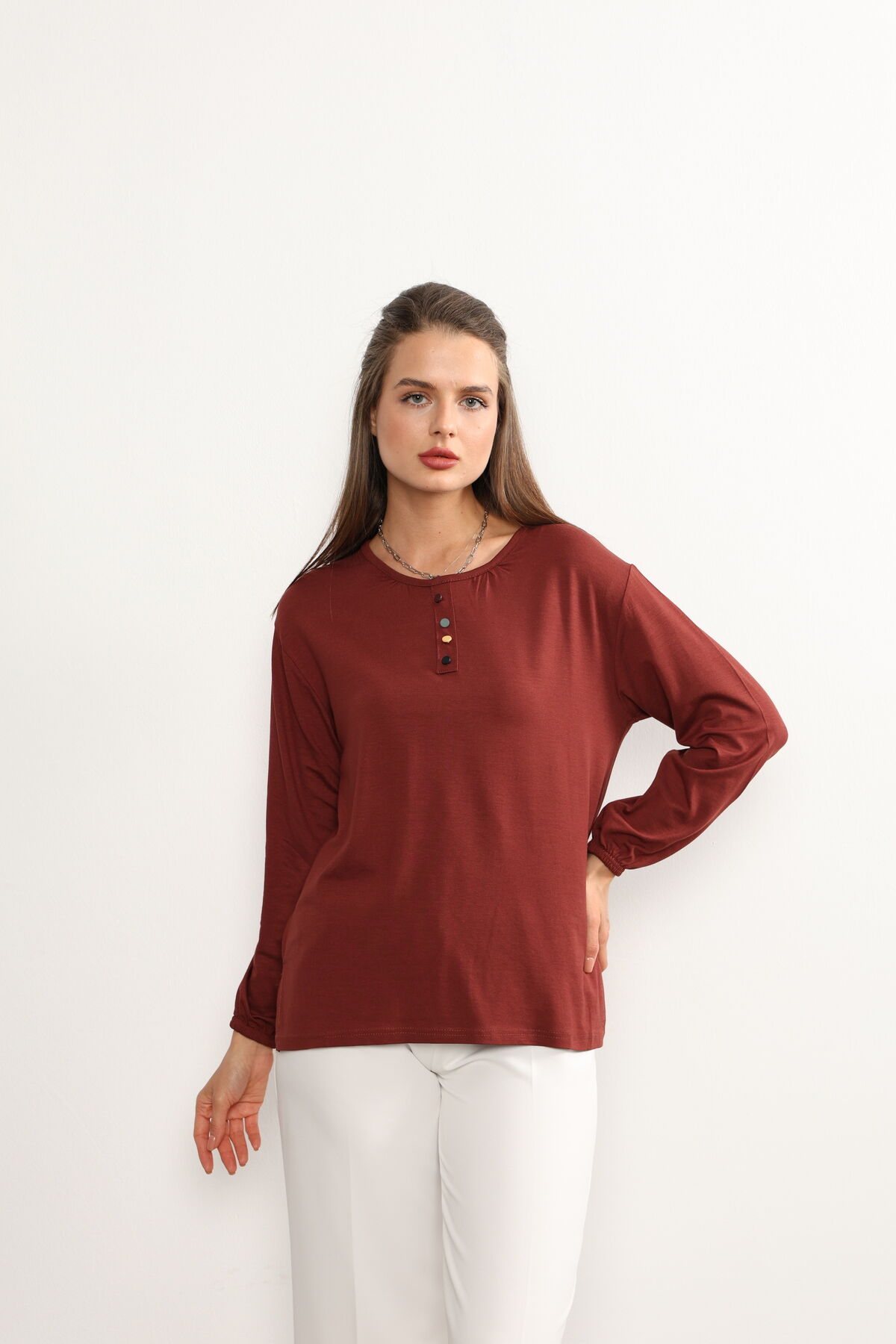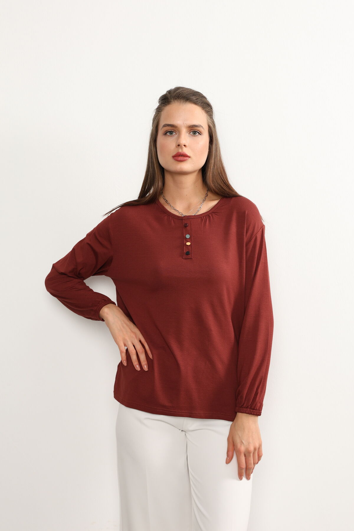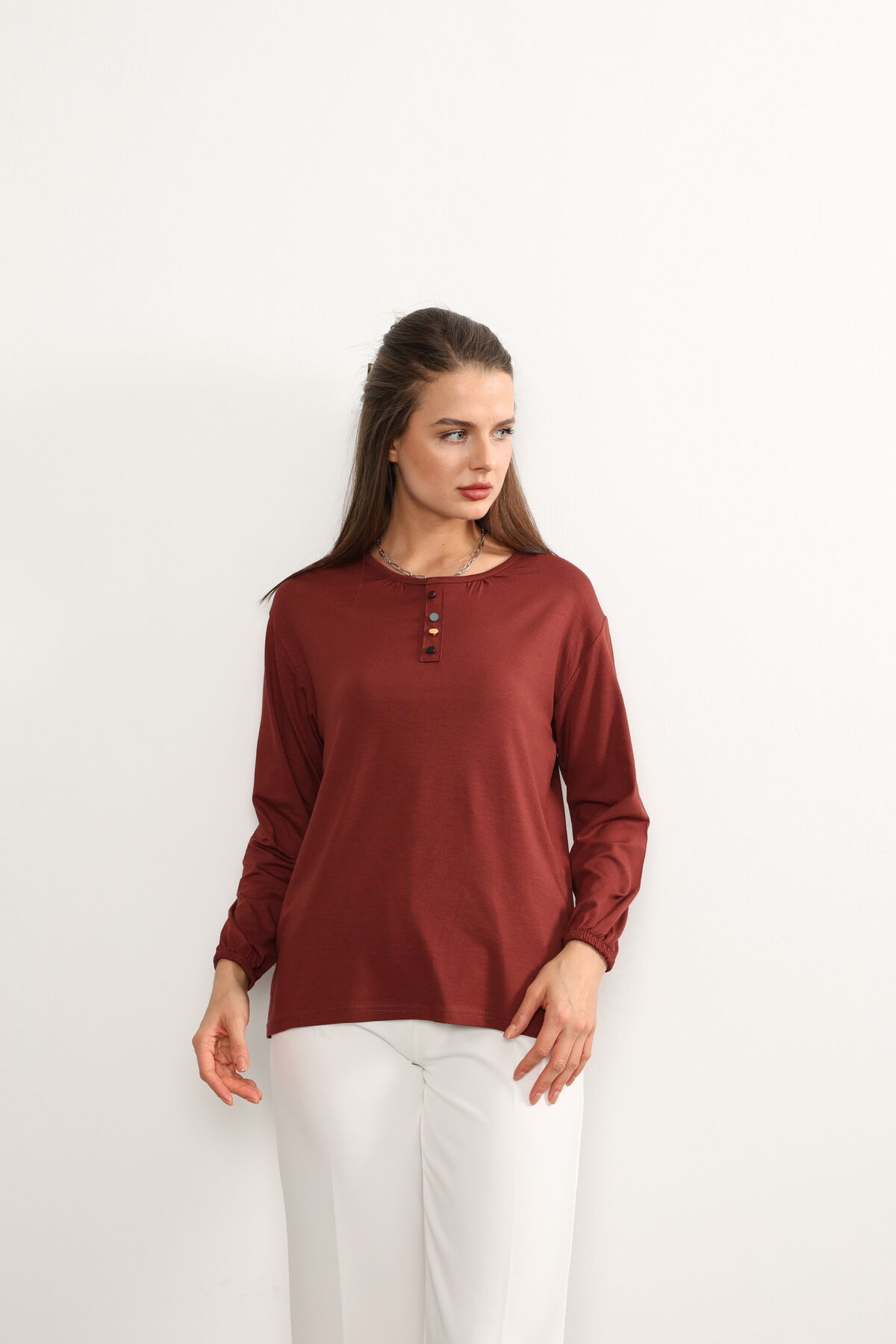 Kadın Likralı Orta Yaş Ve Üzeri Dört Mevsim Yeşil Anne Penye Bluz Düğme Desenli Lastikli Kol Kiremit - 3XL