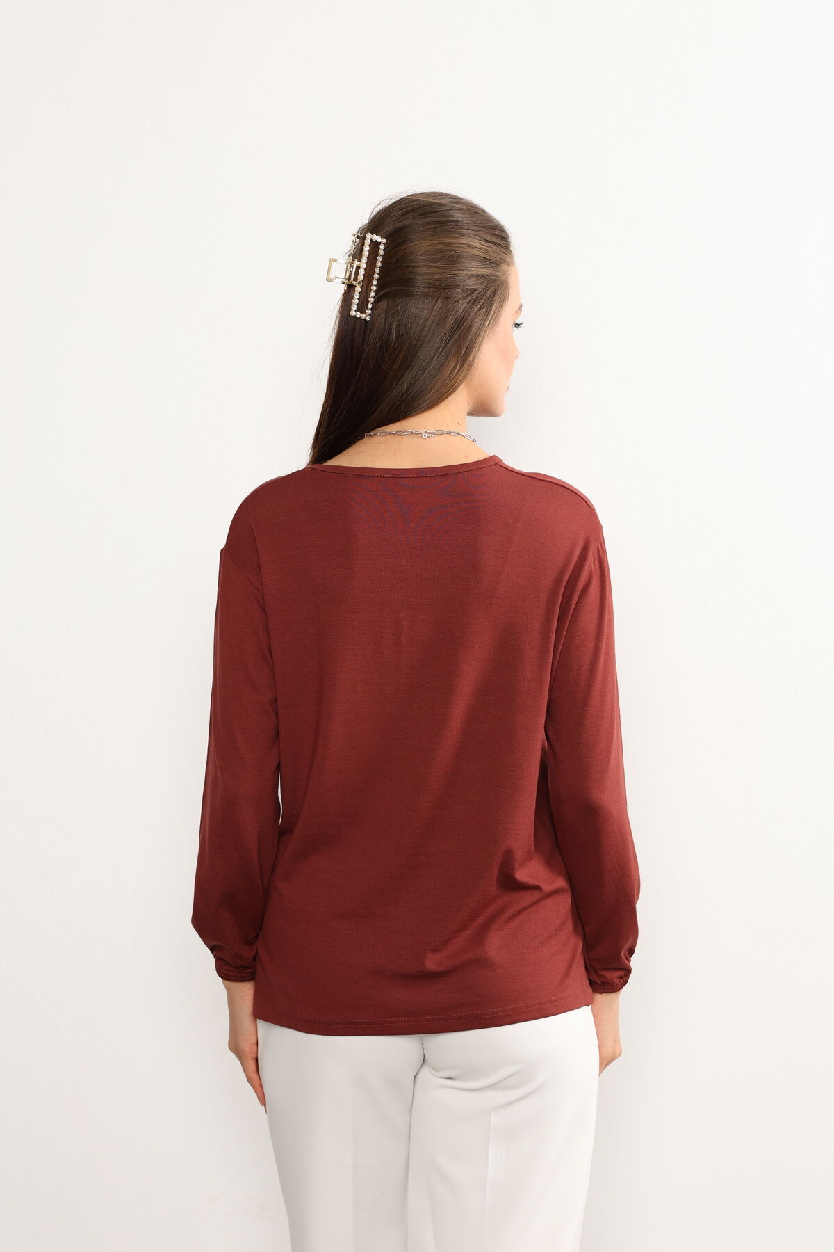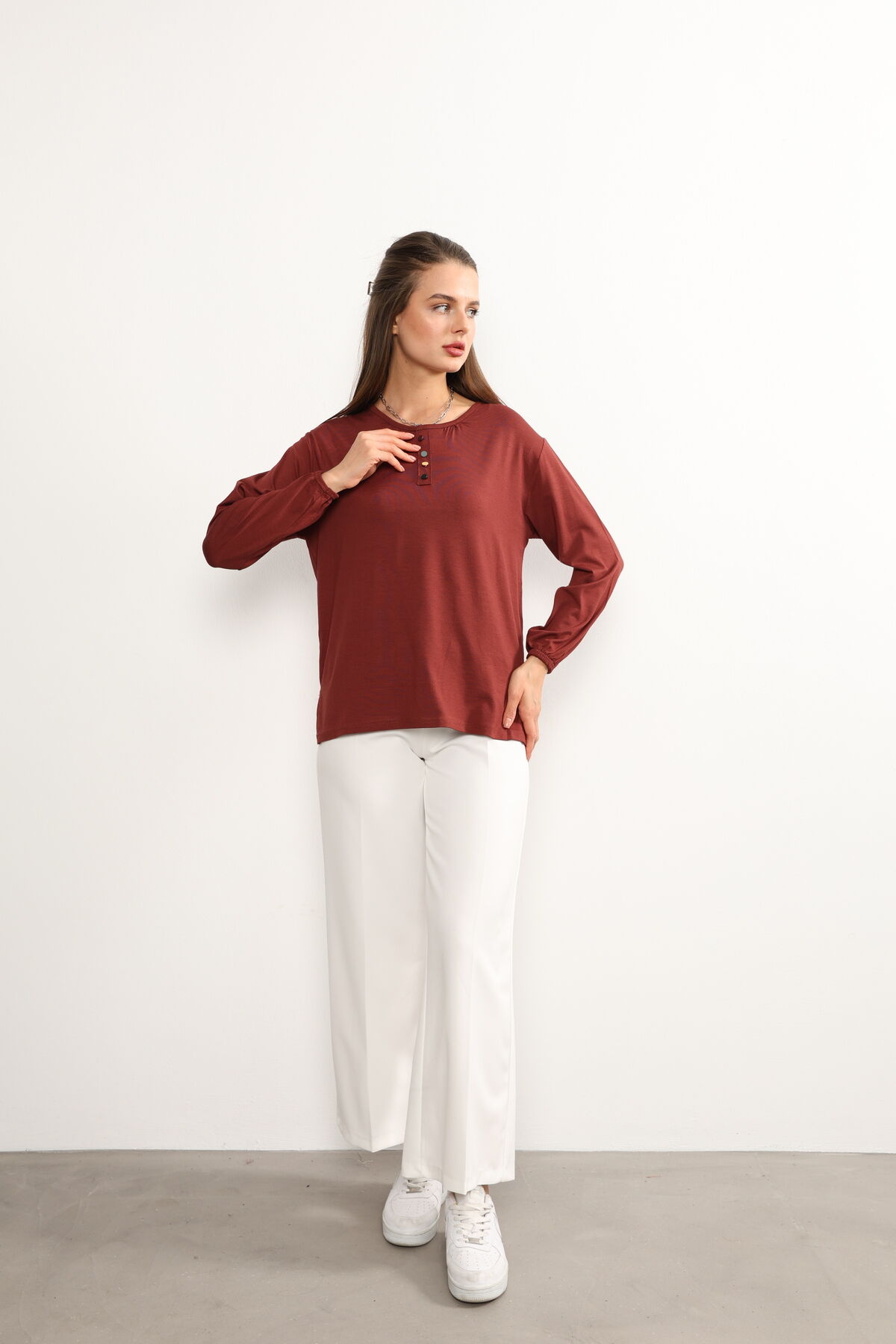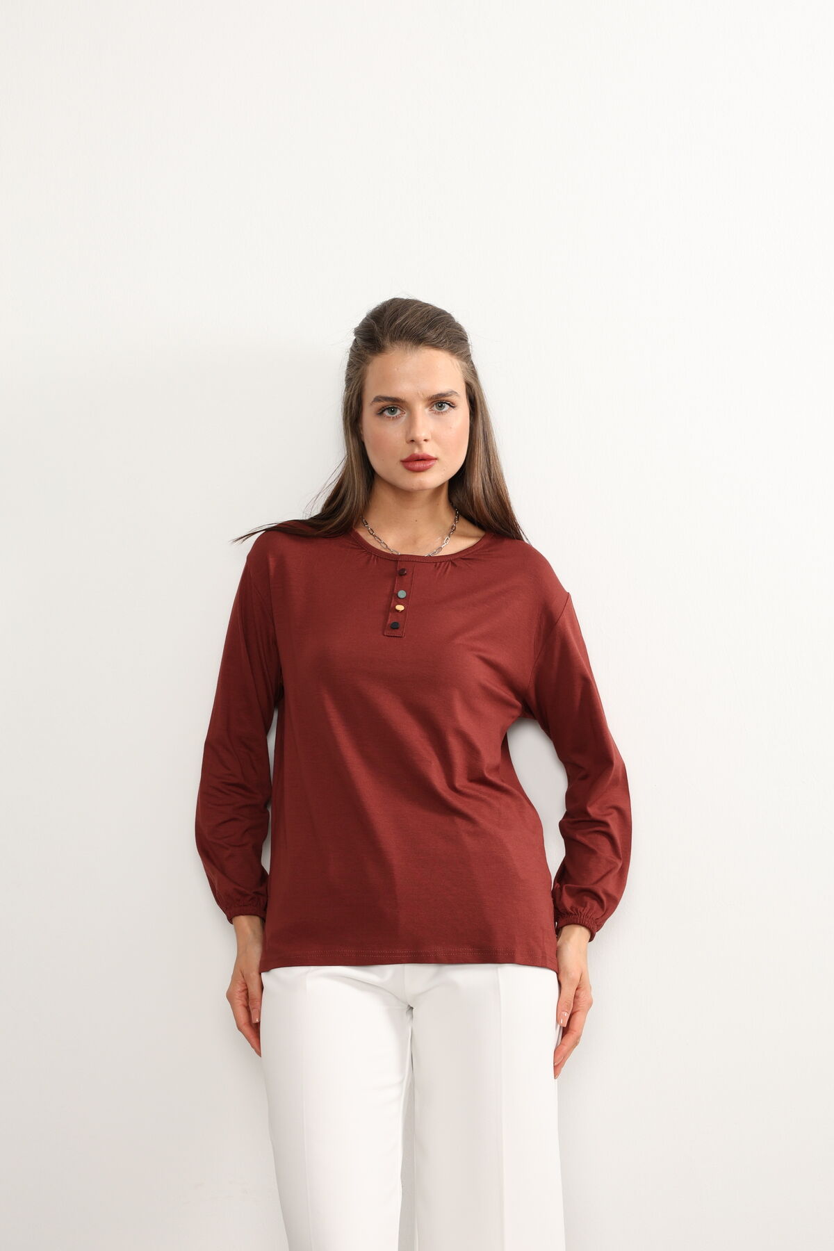 Kadın Likralı Orta Yaş Ve Üzeri Dört Mevsim Yeşil Anne Penye Bluz Düğme Desenli Lastikli Kol Kiremit - 3XL