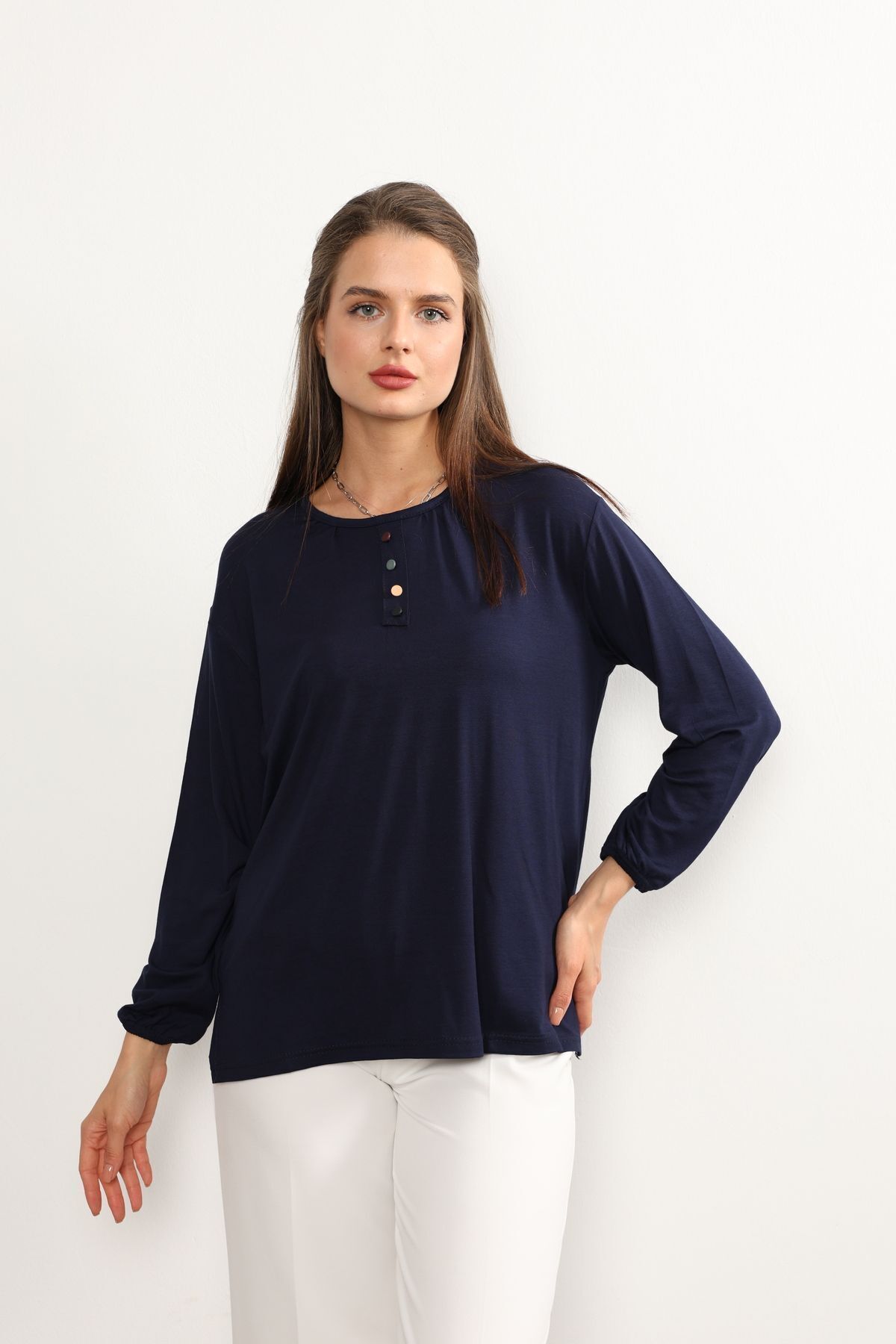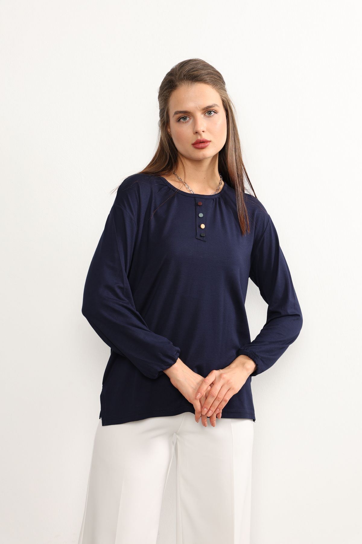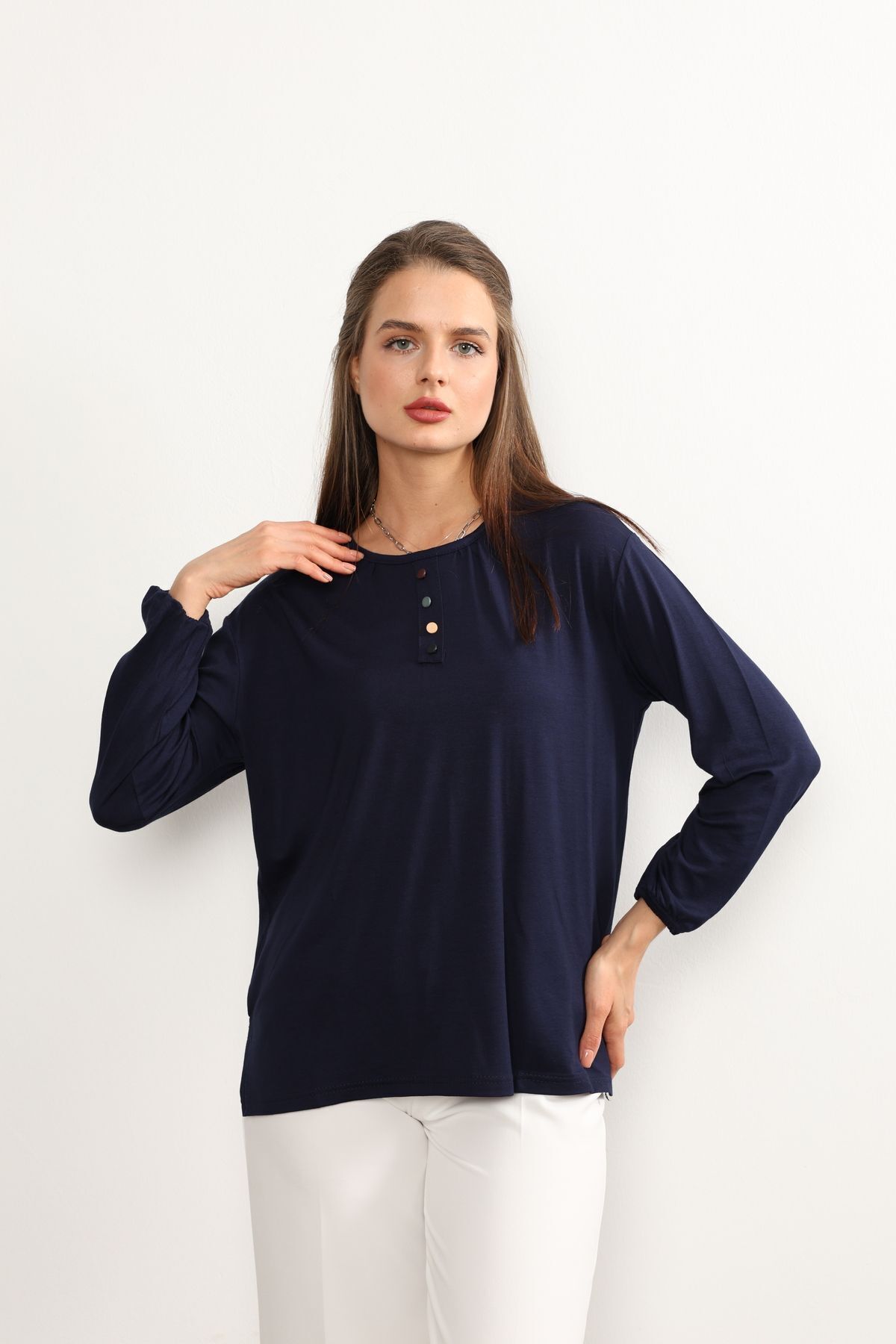 Kadın Likralı Orta Yaş Ve Üzeri Dört Mevsim Yeşil Anne Penye Bluz Düğme Desenli Lastikli Kol Lacivert - 5XL