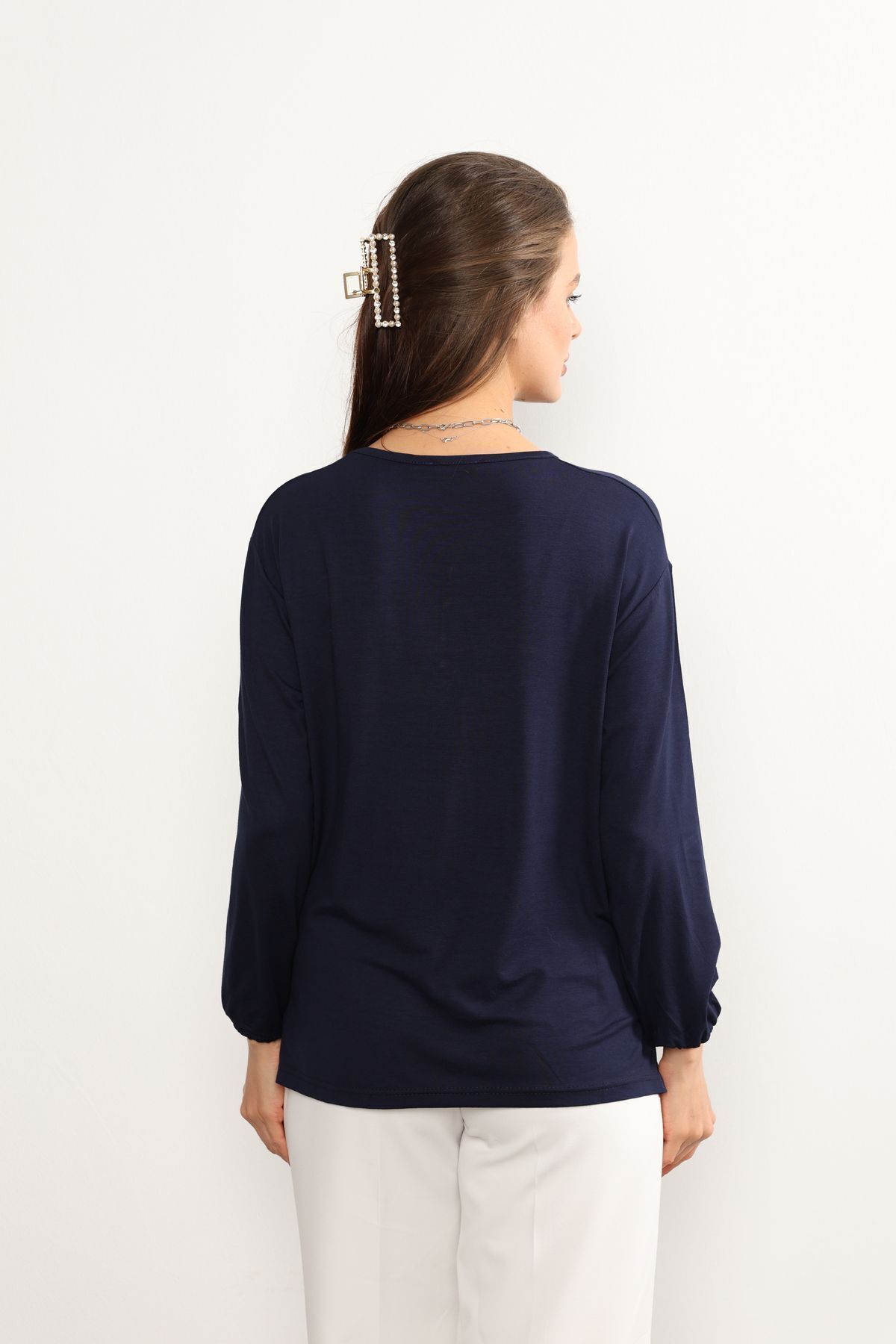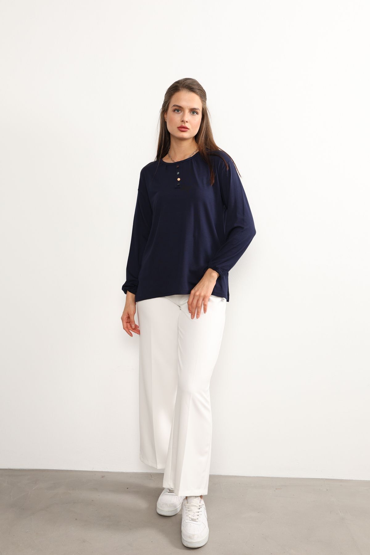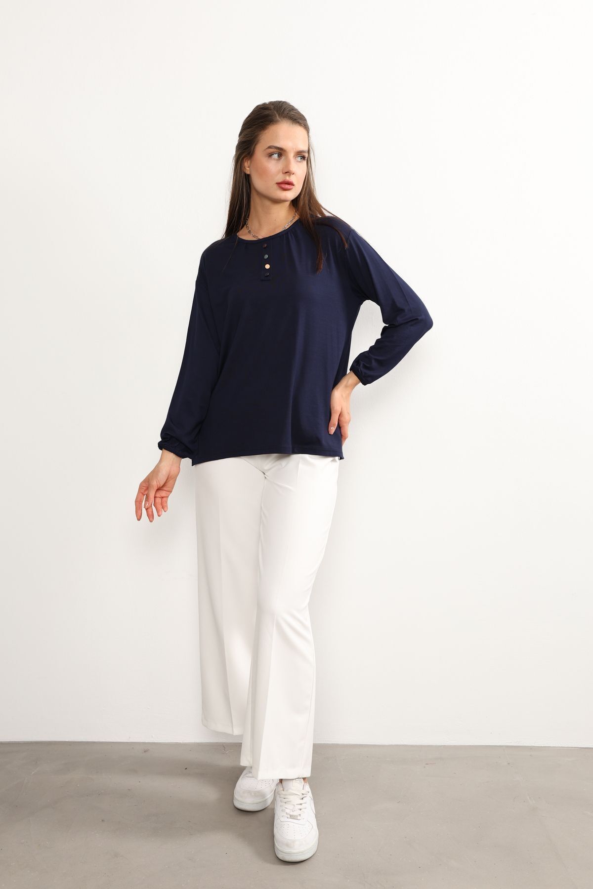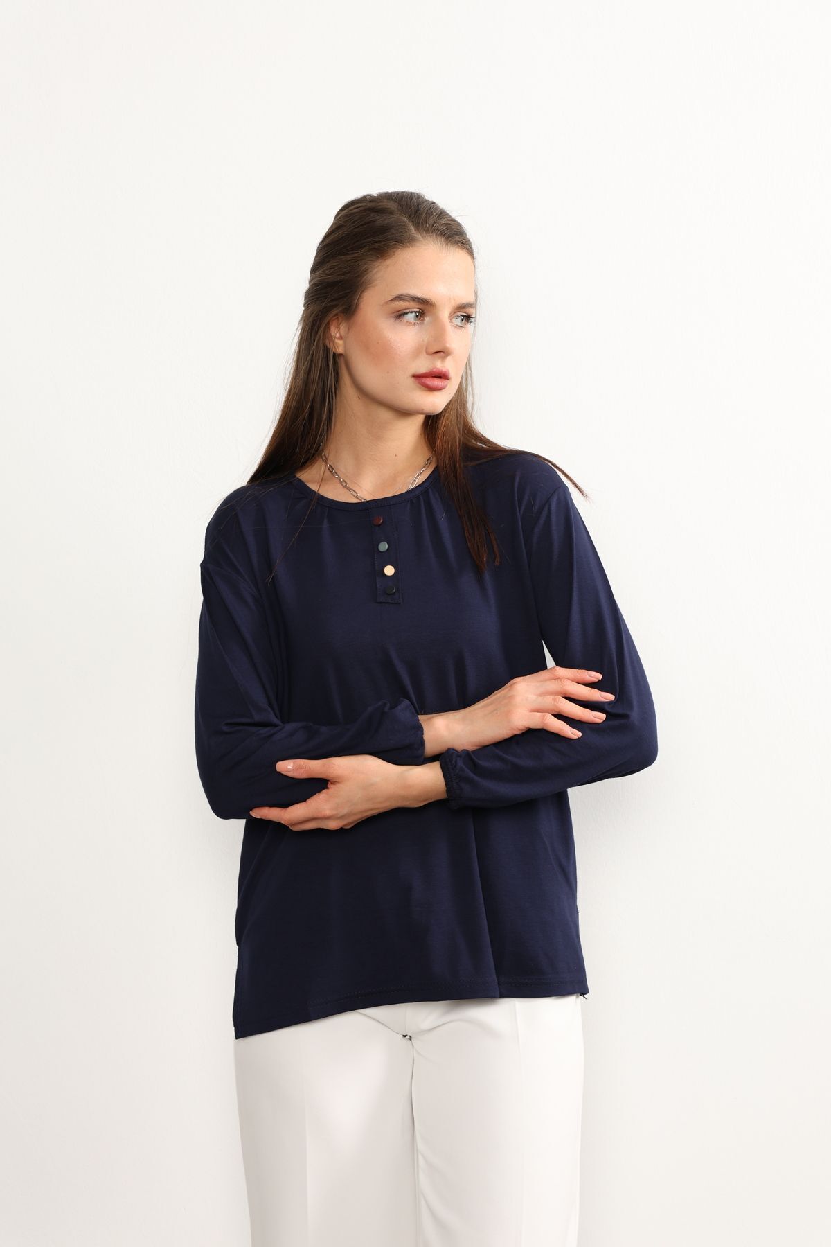Kadın Likralı Orta Yaş Ve Üzeri Dört Mevsim Yeşil Anne Penye Bluz Düğme Desenli Lastikli Kol Lacivert - 5XL